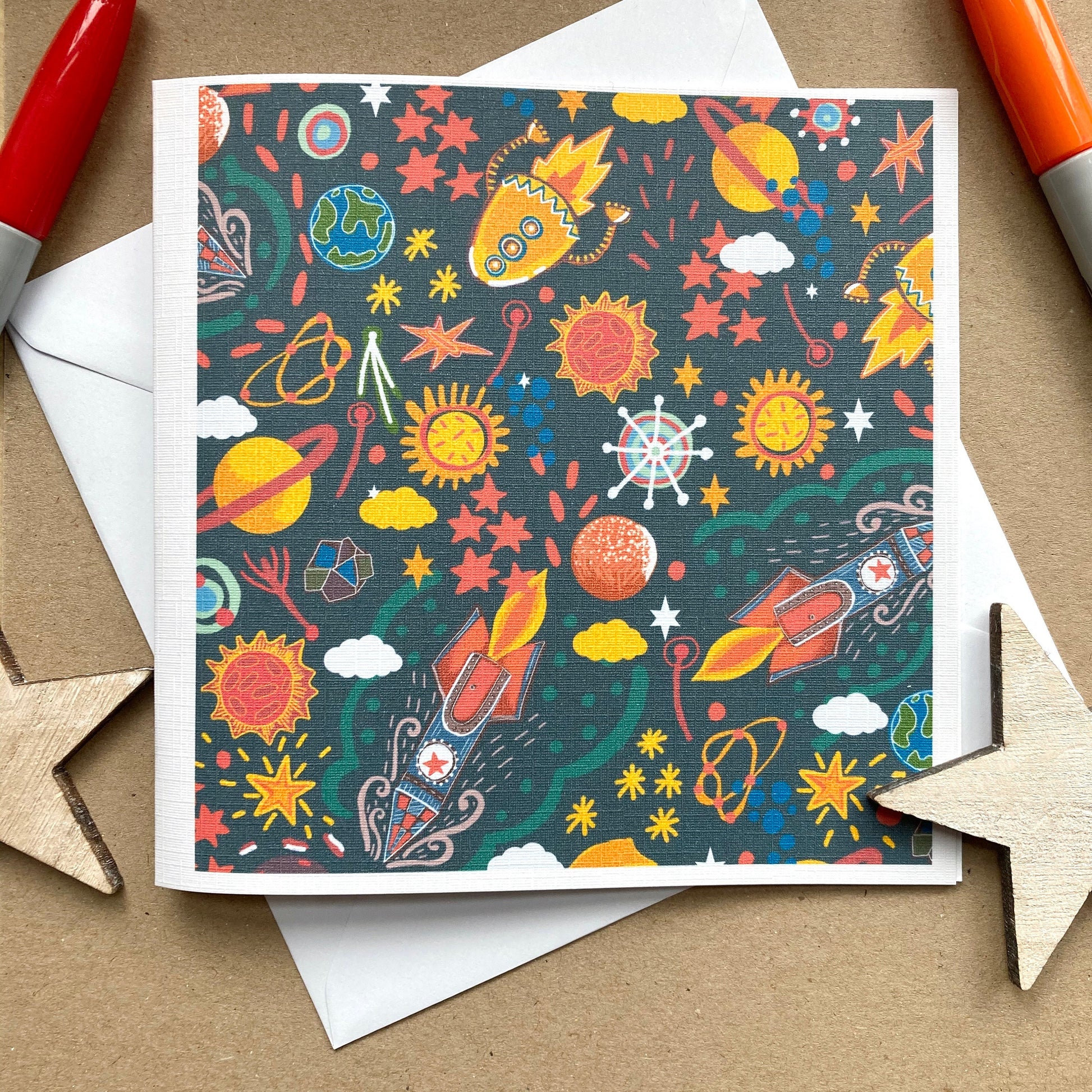 Rocket Ship Birthday Card, Space Greetings Card, Space Lover Card, Children’s Cards, Planets Notecard, Any Occasion, Blank Greetings.
