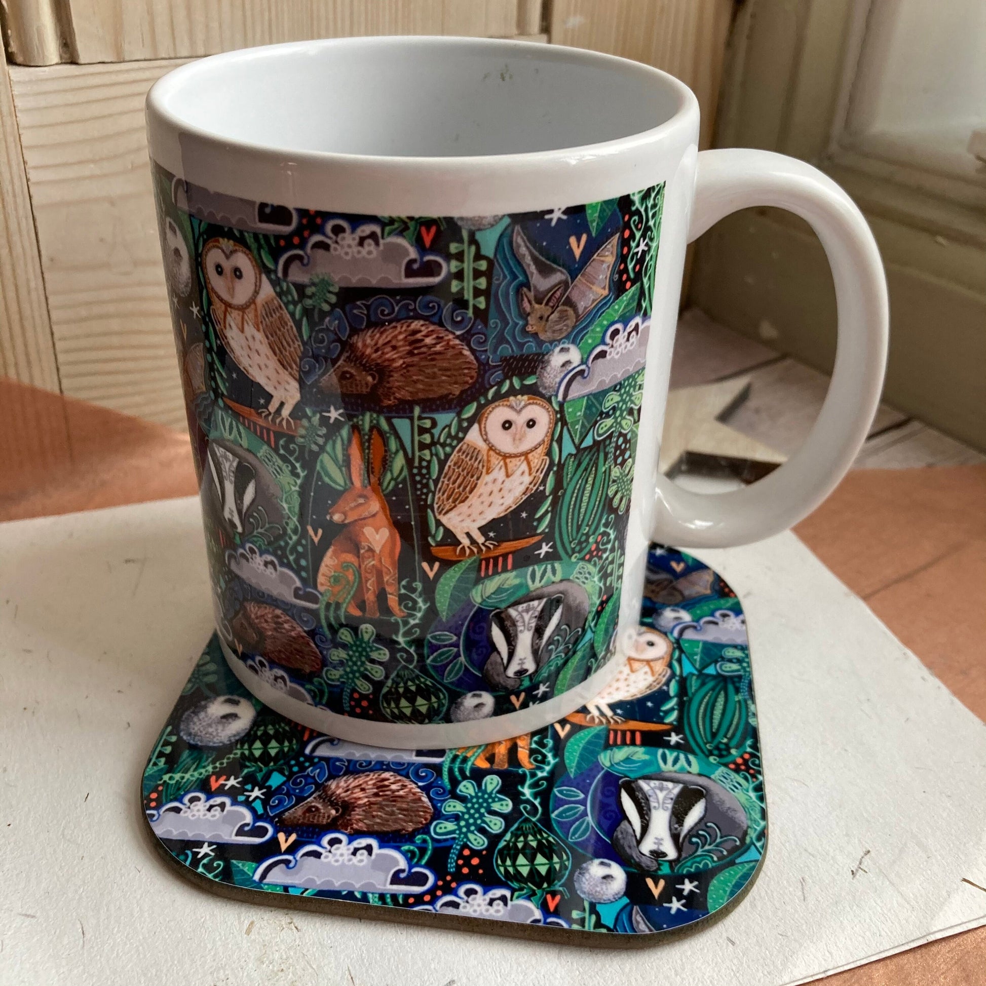 This coaster is full of woodland charm. Printed with an original pattern design it is bright, colourful and unique. It features a badger, an owl, hare and bat in a moonlit woodland setting.